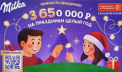 Акция Milka и Oreo, Юбилейное, Пятерочка: «3 650 000 рублей на праздники целый год» с 1 декабря 2025 по 31 января 2026 До начала… Узнать больше » акции